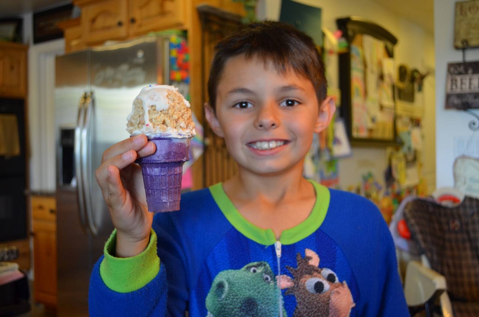 Here is Logan afterschool (notice the pjs at 4 in the afternoon..what can I say, the apple doesn't fall far from the tree!) getting ready to enjoy his treat.